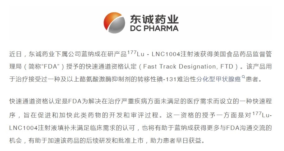 近日,東誠藥業(yè)下屬公司藍(lán)納成在研產(chǎn)品177Lu - LNC1004注射液獲得美國食品藥品監(jiān)督管理局(簡稱“FDA”)授予的快速通道資格認(rèn)定(Fast Track Designation, FTD...